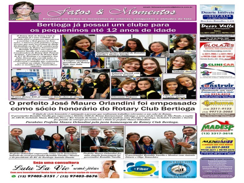 A Coluna Fatos Momentos do Jornal Da hora de Bertioga destaca a fundação do Rotary Kids e da posse do prefeito Jose Mauro Orlandini como sócio honorário do Rotary Club de Bertioga