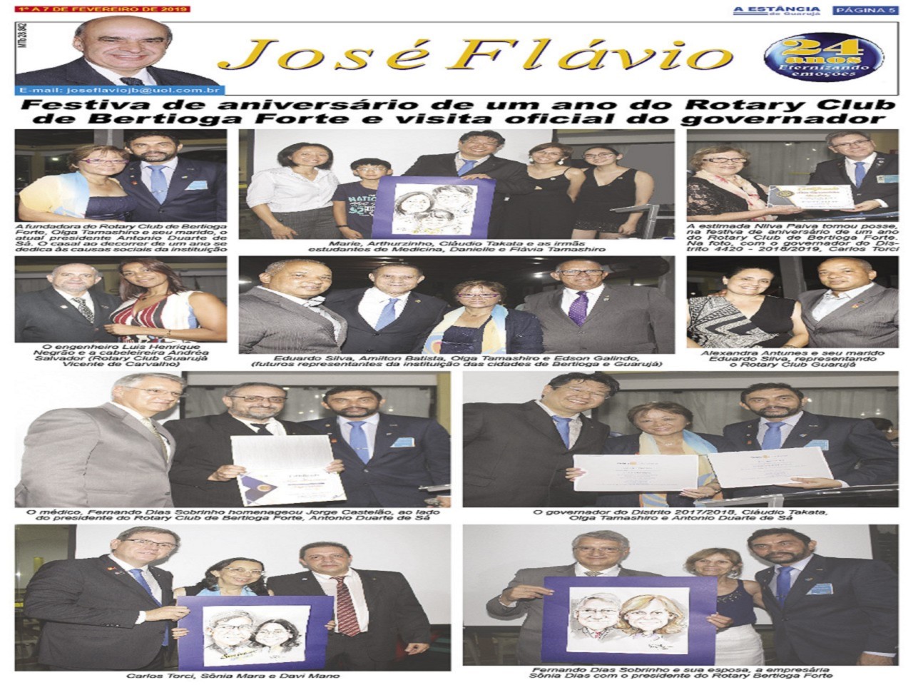 O Colunista José Flavio do Jornal A Estância do Guarujá dedicou uma página ao Rotary Club de Bertioga Forte destacando o aniversário de um ano de fundação, a visita do governador Carlos Torci, as posses de sócios honorários e representativos e as homenagens ao nosso querido governador Claudio Takata e Fernando Dias Sobrinho.